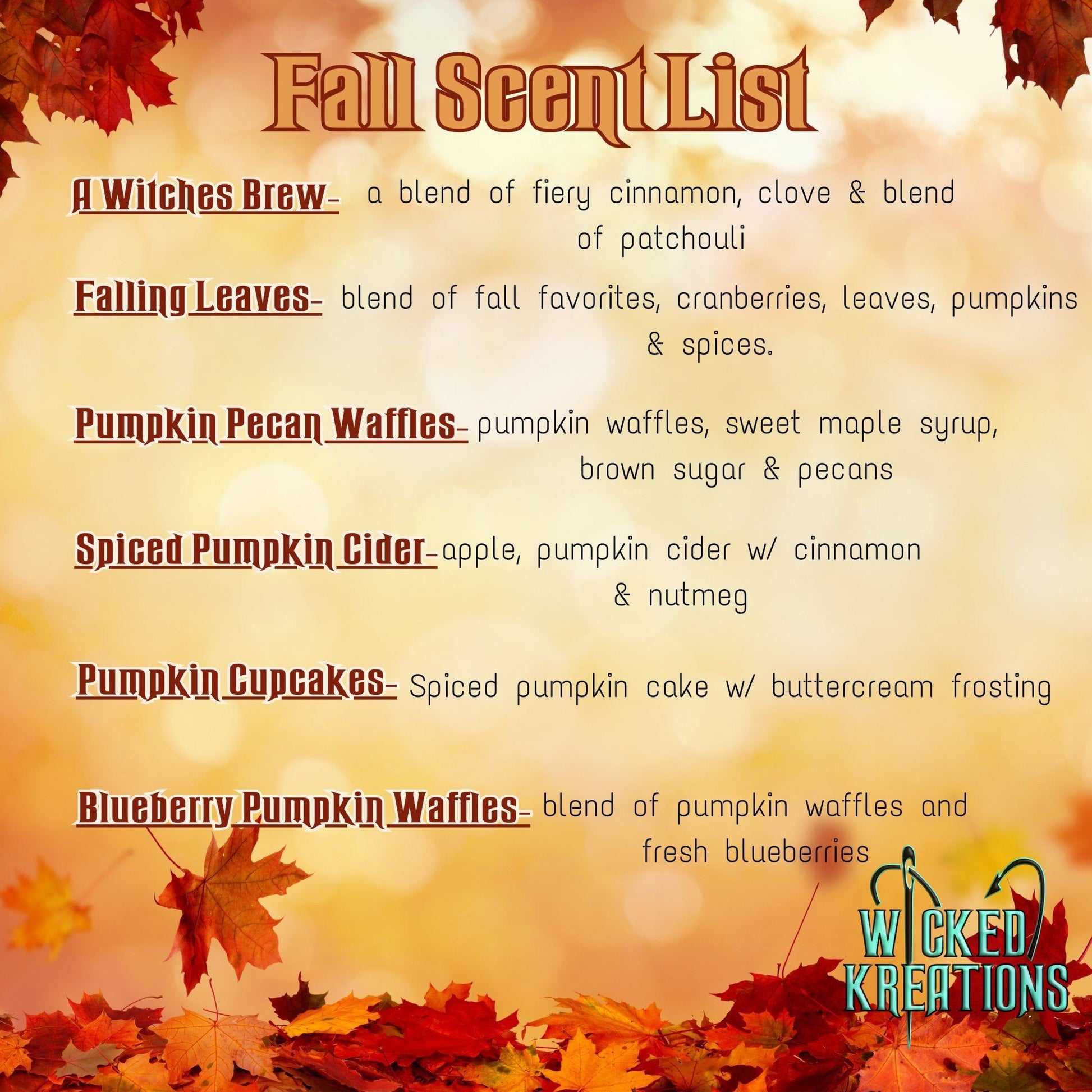- Falling Leaves- blend of fall favorites, cranberries, leaves, pumpkins and spices.